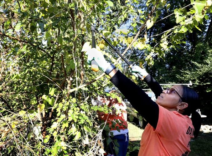 United Way Day of Caring Volunteer Taylor Young of Front Royal, an employee of Thermo Fisher Scientific in Middletown, uses a pole saw on Friday to remove a dead maple tree branch in the backyard of a Winchester home that has been purchased by a partnership with WATTS for use as transitional housing.